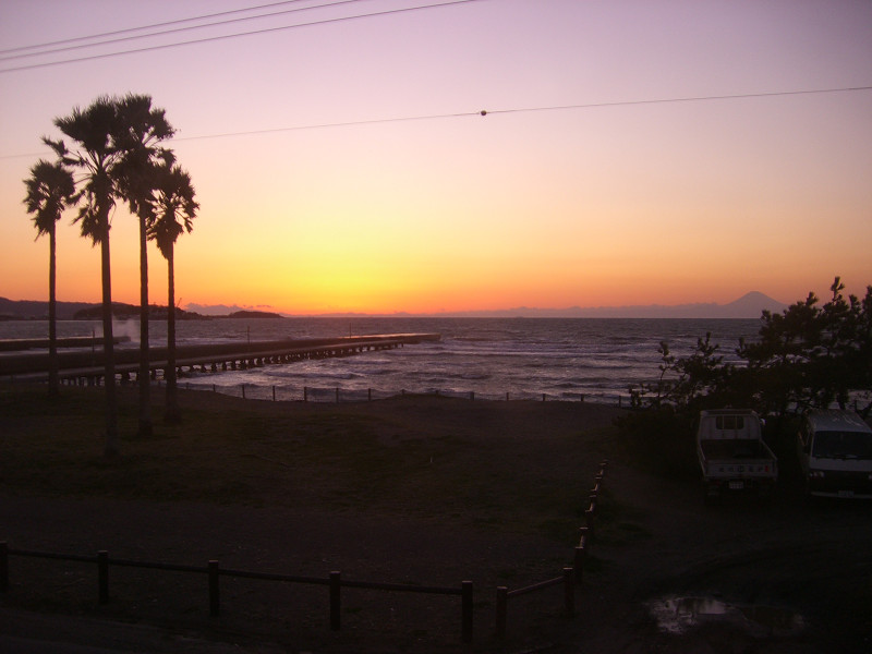 宿に到着です。宿からは海を見渡すことが出来ました。夕日に染まる海を一枚。/^o^\フッジッサーンなんかも見えます。