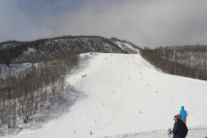 すでに何人かの人が滑っています。大して急じゃないように見えて実は急だったりする。