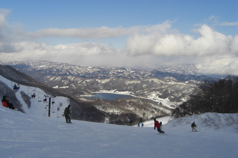 リフトで上に上っていきます。そこにはすばらしい景色が広がっていました。正面に見える湖は青木湖。今度ここにも行ってみない?