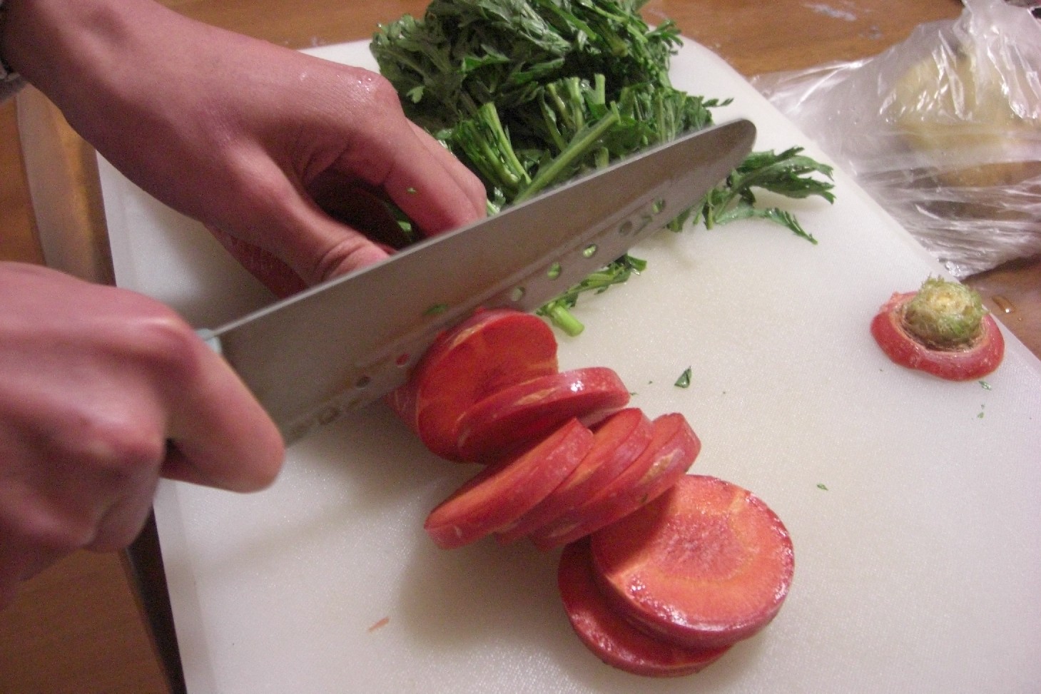 スーパーの店員さんにおすすめされた一本150円の人参を切り刻みます。