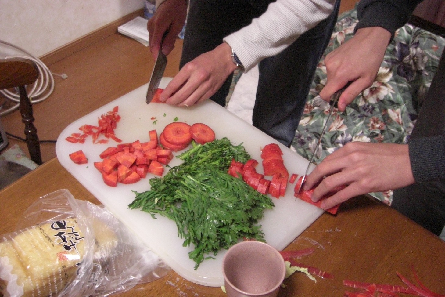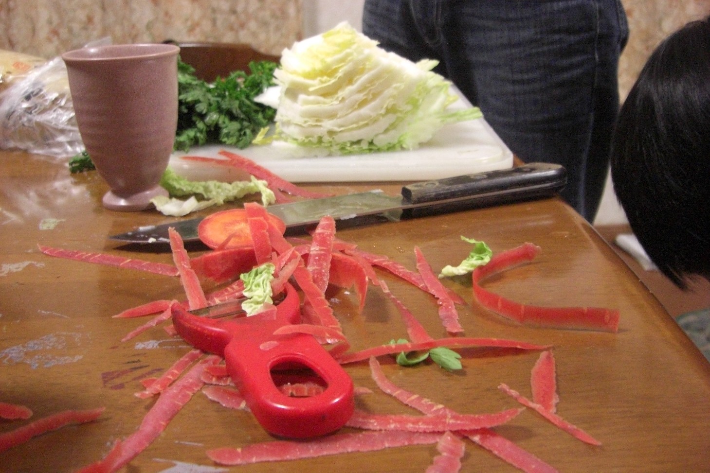 人参の皮が机の上に散乱してます。※人の家です