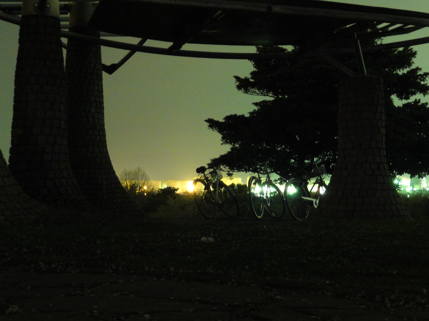 止めた自転車の向こうには眠らない都市の光が輝く。