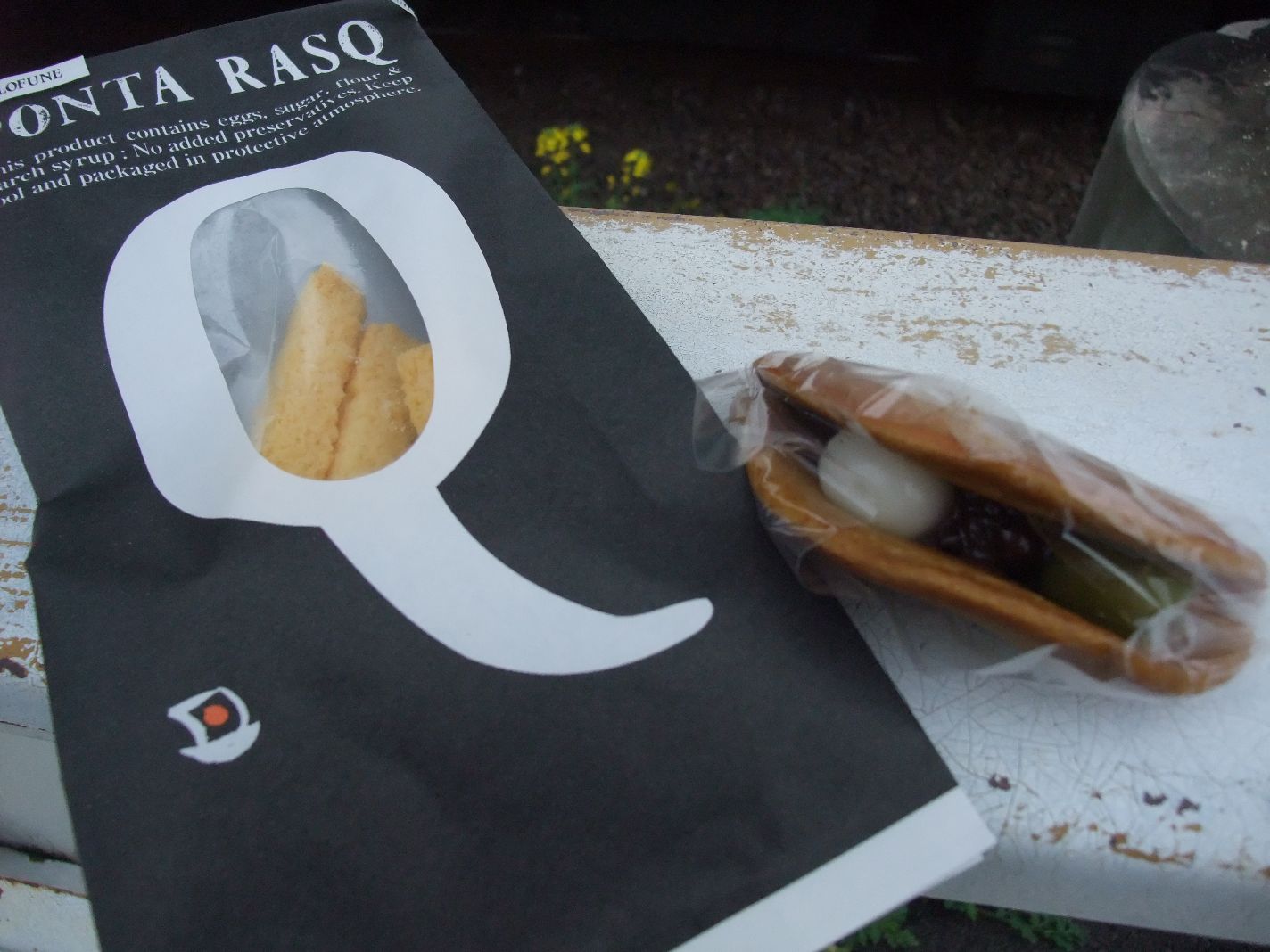 こちらはカステラの店です。棒状の焼きカステラのような商品、こちらは本単位で購入する事が出来ます、と、茶玉という240円の甘味を購入しました。レシートを取っておいて本当に良かったと今痛感しております。