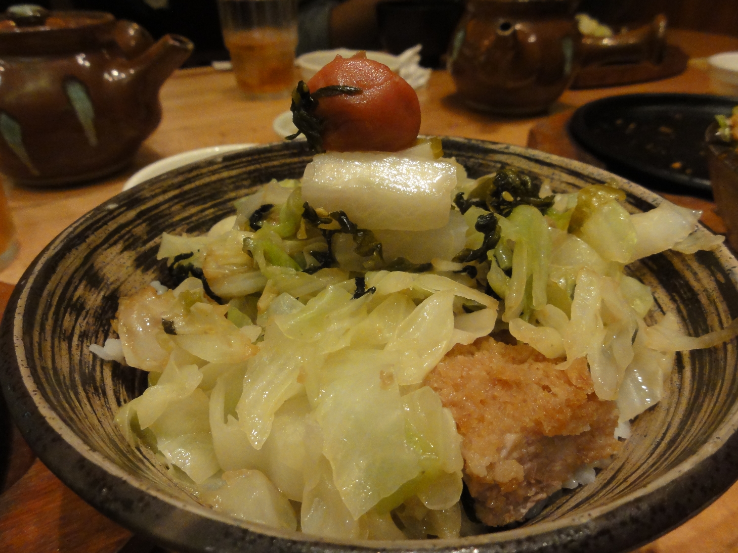 とんかつなのに漬物やら梅干しなんかも乗っけてしまいましょう。