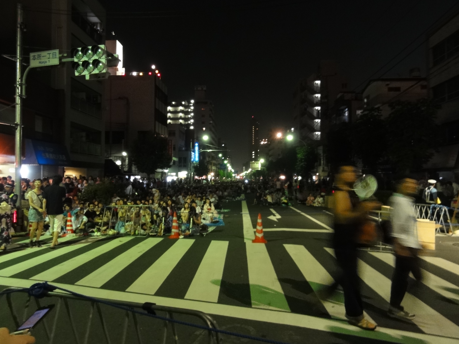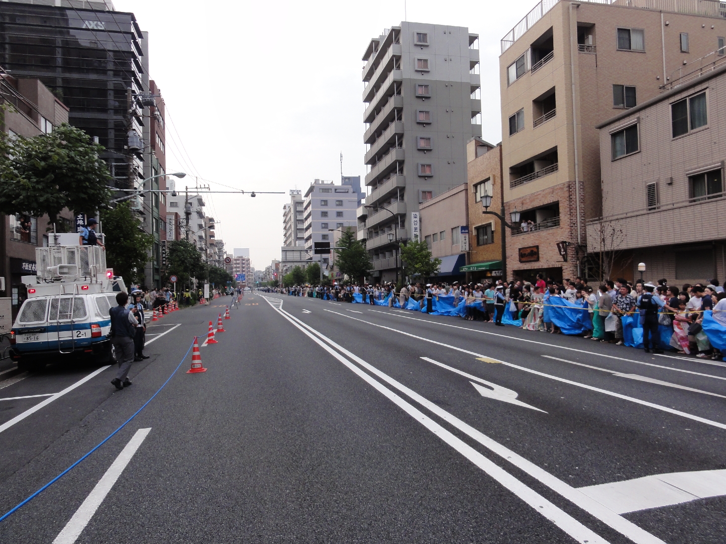 橋での観覧はあっという間に終わってしまいます。再び道路のほうへ行ってみます。みんな真剣に見ています。