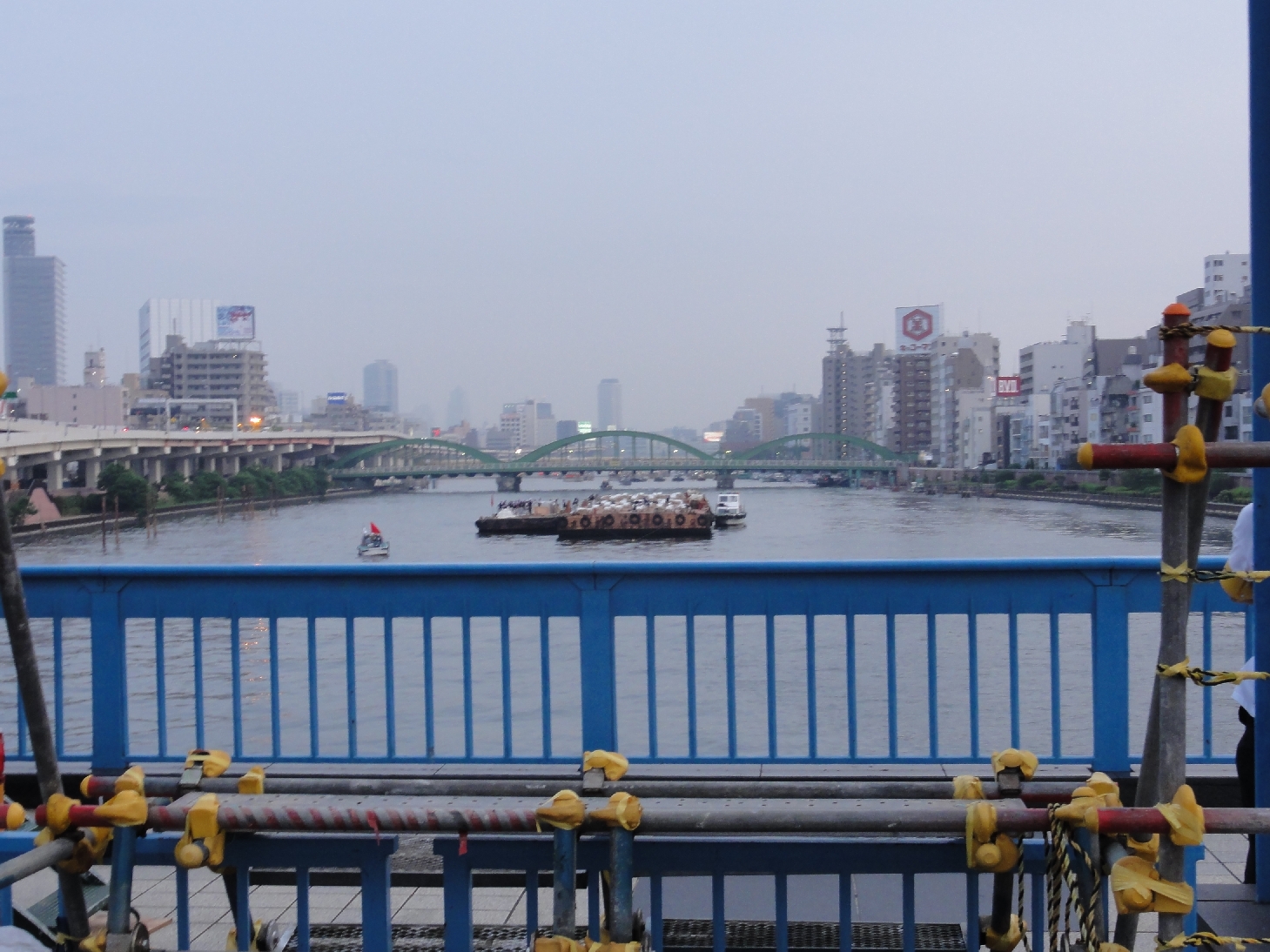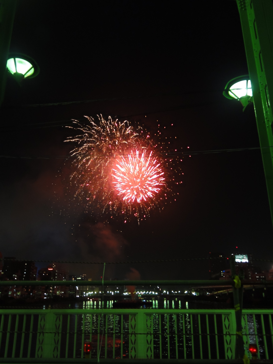 ついに隅田川に着きます。橋を渡っているとちょうど花火のようなものが打ち上げられていました。これが超迫力です。橋から見える位置で上げられているので空気の振動が伝わってくるほどでした。