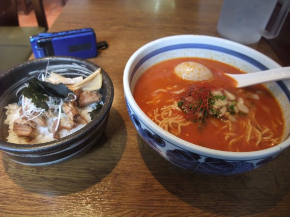今回注文したのは、当然ながらアーモンド坦々麺です。つけ麺ver.もあるので、次に行く機会があればそちらにしましょう。もののついでにミニチャーシュー丼と味玉も付けてみた。(計1300円)