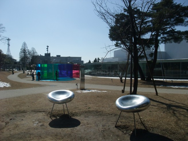 さて、兼六園を出た辺りからですね。近未来的な椅子と極彩色な空間が魅力的な21世紀美術館にやってきました。