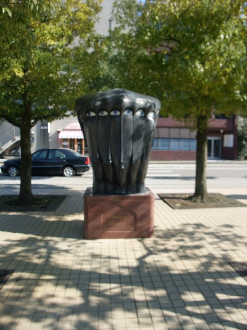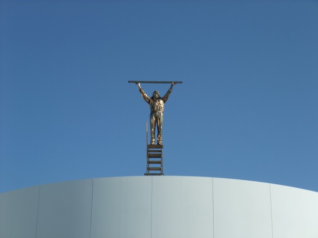 そろそろ昼食に向かいます。こちら市役所近くにあった、幼少期に見たら無意識下に刻み込まれて一生もんのトラウマになる事間違いなしの彫像。シュールの境地ですね。