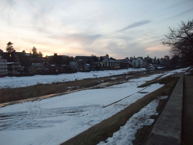 商店街を抜けきった後は、犀川沿いに戻ります。黄昏る日暮れ。