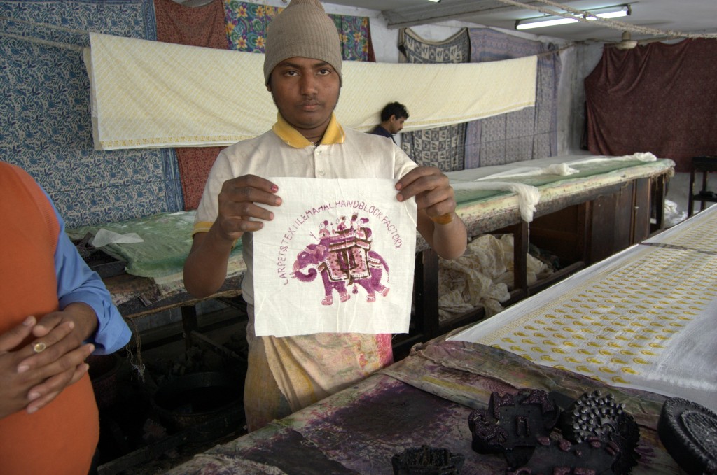 手押しスタンプで布を作っていました。やっぱりインドといえば象なんですかね。