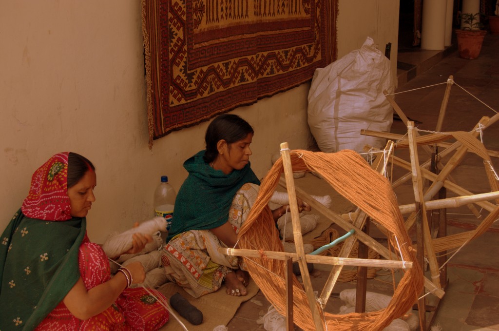 糸車を前に座っている女性たち。観光客向けのアピールなのでしょうか。