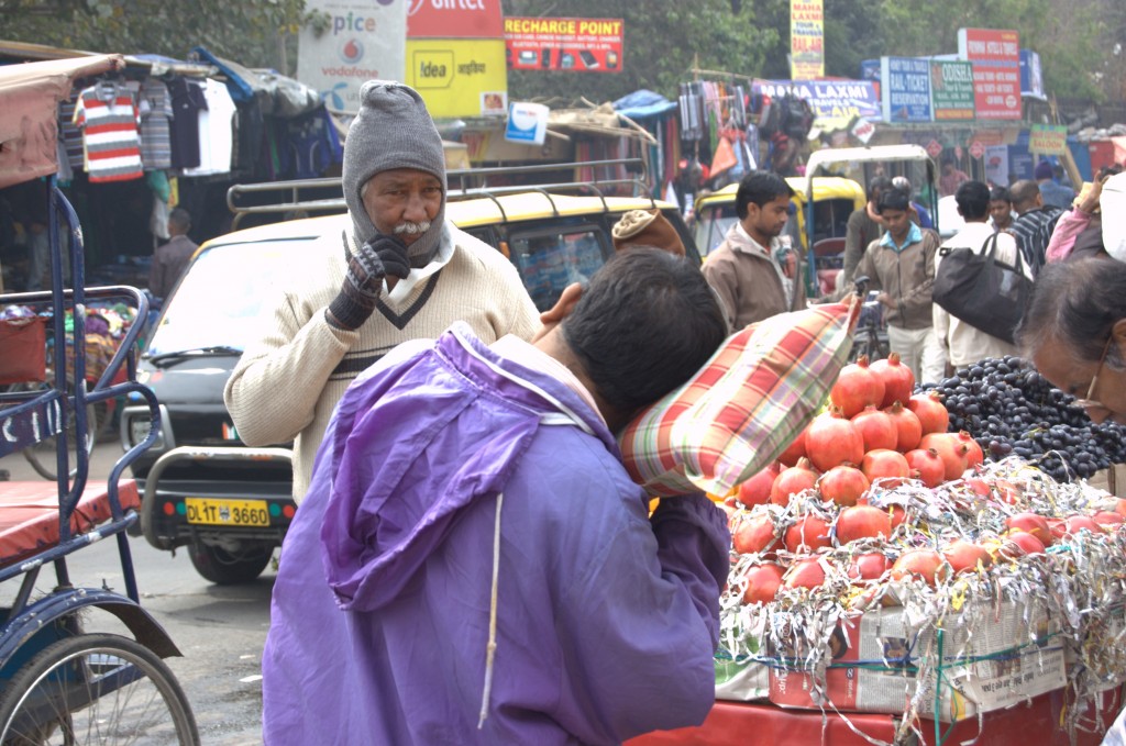 市場ではなぜか枕を頭に当てているおじさんが。売り物なのでしょうか。