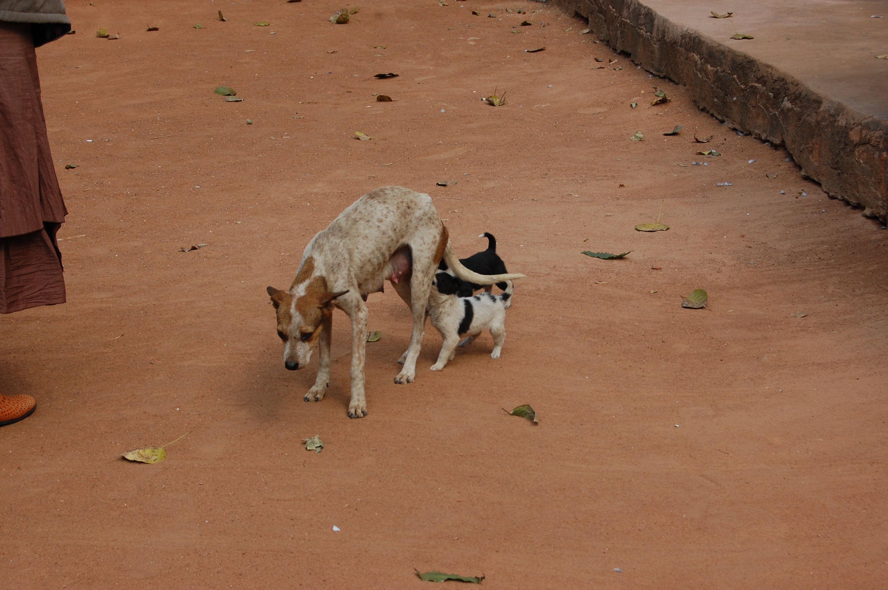 入り口付近にいた犬。出産直後らしく、子犬が乳を飲んでいました。近くには死にかけの犬も・・・。