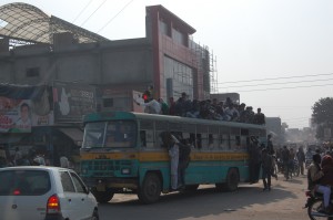 続いては移動中の車内から。インド式、バス乗車術です。ちなみにこの後バスが急停車したせいで屋根の上の人たちがつんのめってました。あんまり真似したくない・・・でもちょっと楽しそう。