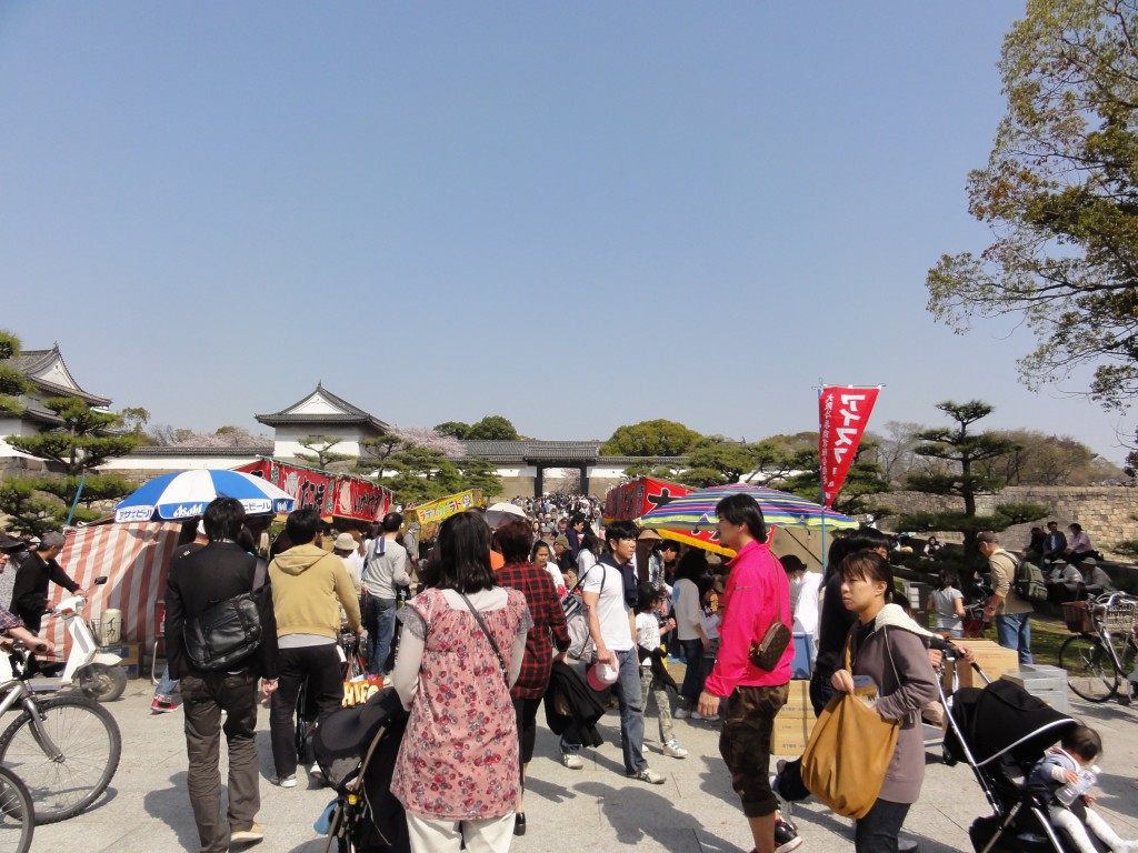 大阪城に突入してみましょう。ちょうど桜の見ごろだったこともあり、入口は屋台やら人やらでとても賑やかです。