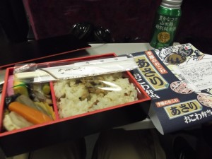 夕飯がてら駅弁と日本酒を頂きます。快適な緑の車に揺られつつ、程良い満腹感と酔いを味わう旅のスタート。