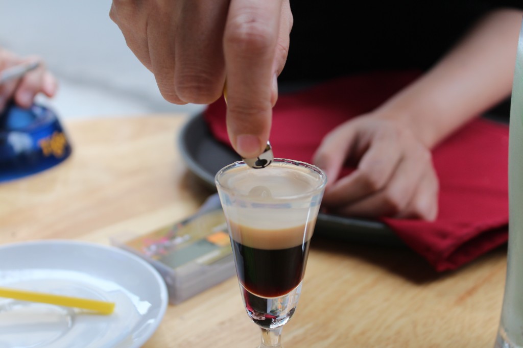 B52というなんとも笑っていいのかわからない名前のカクテルです。このカクテルは飲み方がまた独特で面白い。上澄みのアルコールにライターで火をつけ、火のついた状態で一気に飲み干す!!