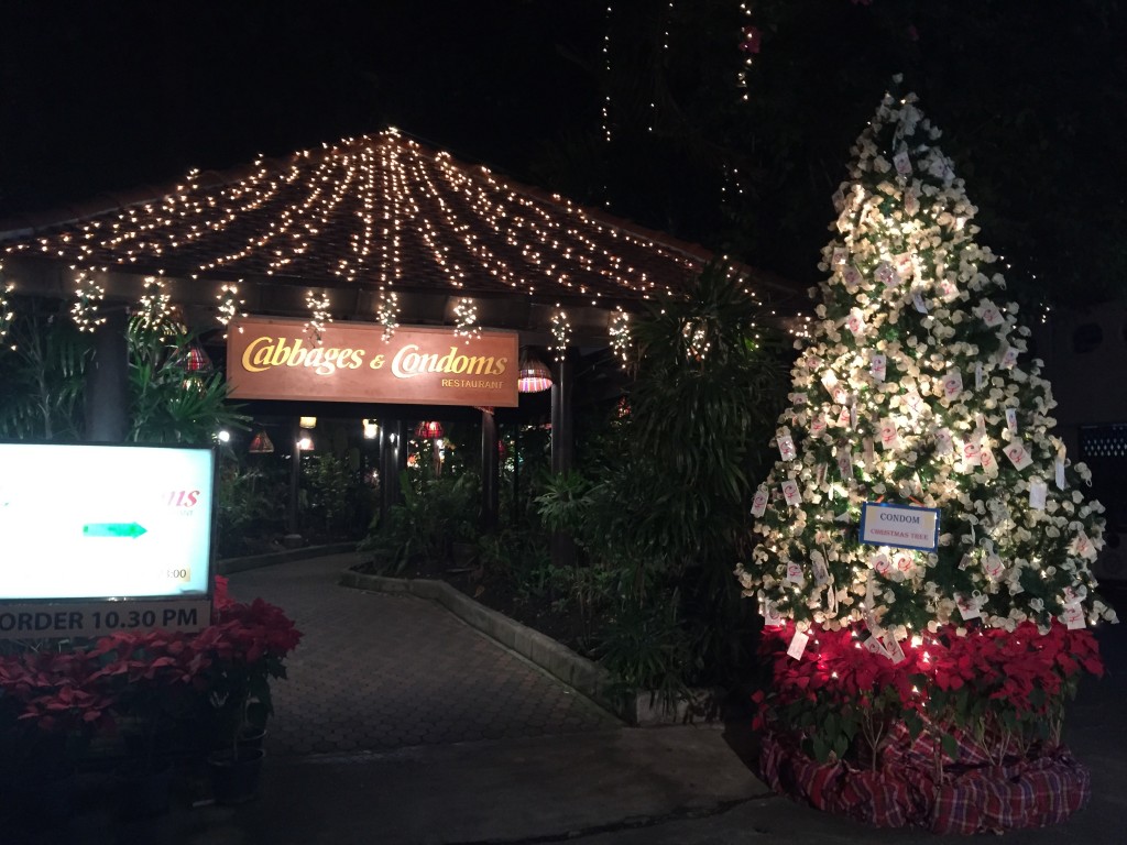 さて、夕食です。キャベジズ&コンドームズというレストランですが、音の響きが気に入って決定したところ、実際に避妊具をタイに広めた方がオーナーだそうです。