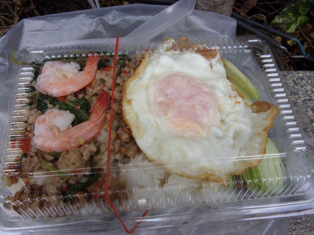 パックに入ったタレをかけて食べるのですが、ピリ辛の風味がまして美味しかったです。30バーツくらいと格安なのもいいですね。