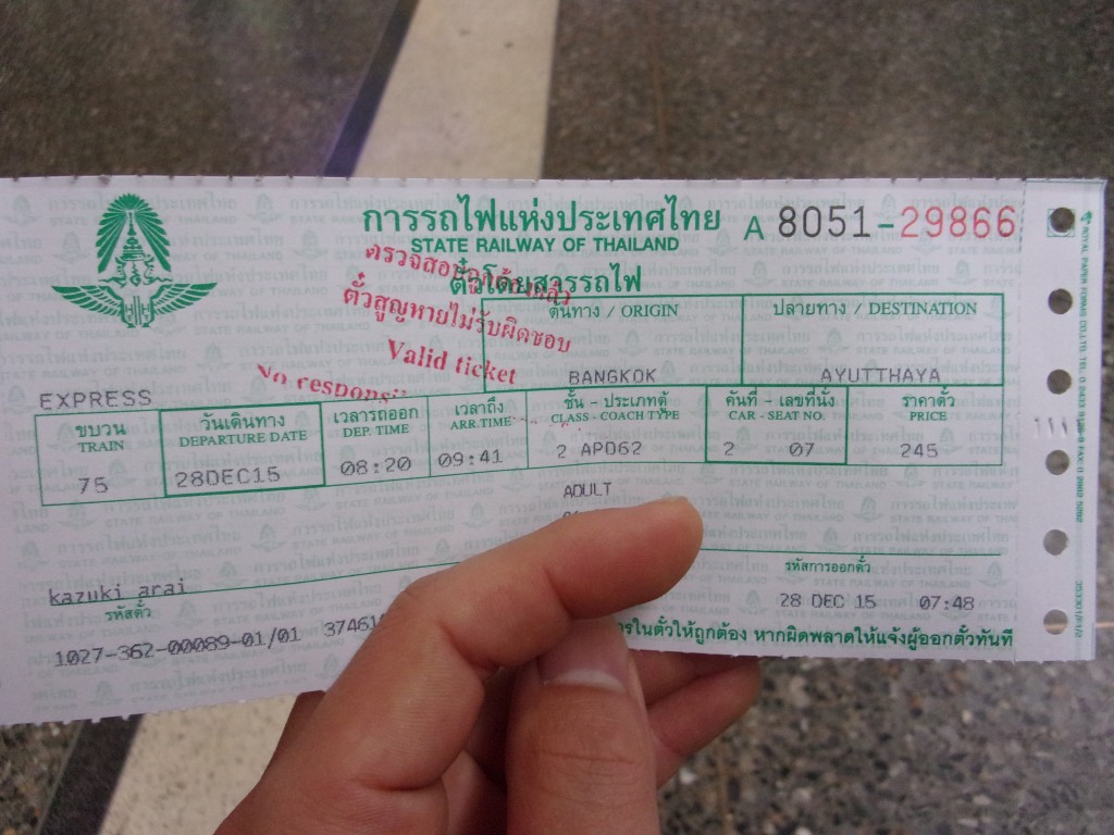 窓口で「アユタヤ―」なんて言うと切符を手に入れることが出来ます。20バーツくらいの普通席もあるのですが、QOLを重視するため指定席券を購入です。